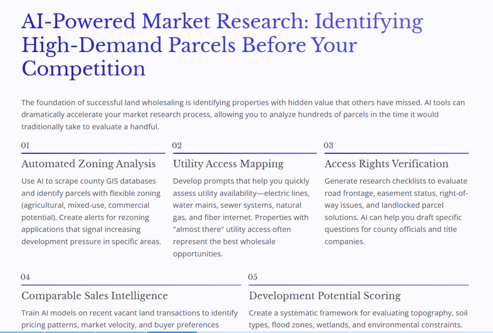 AI-Enhanced Research Tools: Systematically find hot parcels before your competition. Includes prompt libraries, scripts, and checklists for: