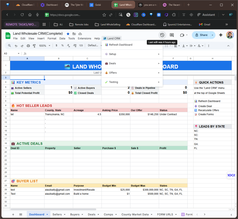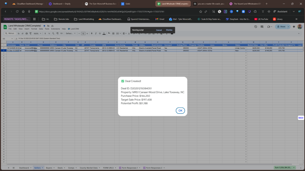 ✓ Deals Dashboard — Highlight any seller lead and hit "Create Deal From Selected Seller" — instantly spins up a trackable deal record with all their info and calculated offer ranges